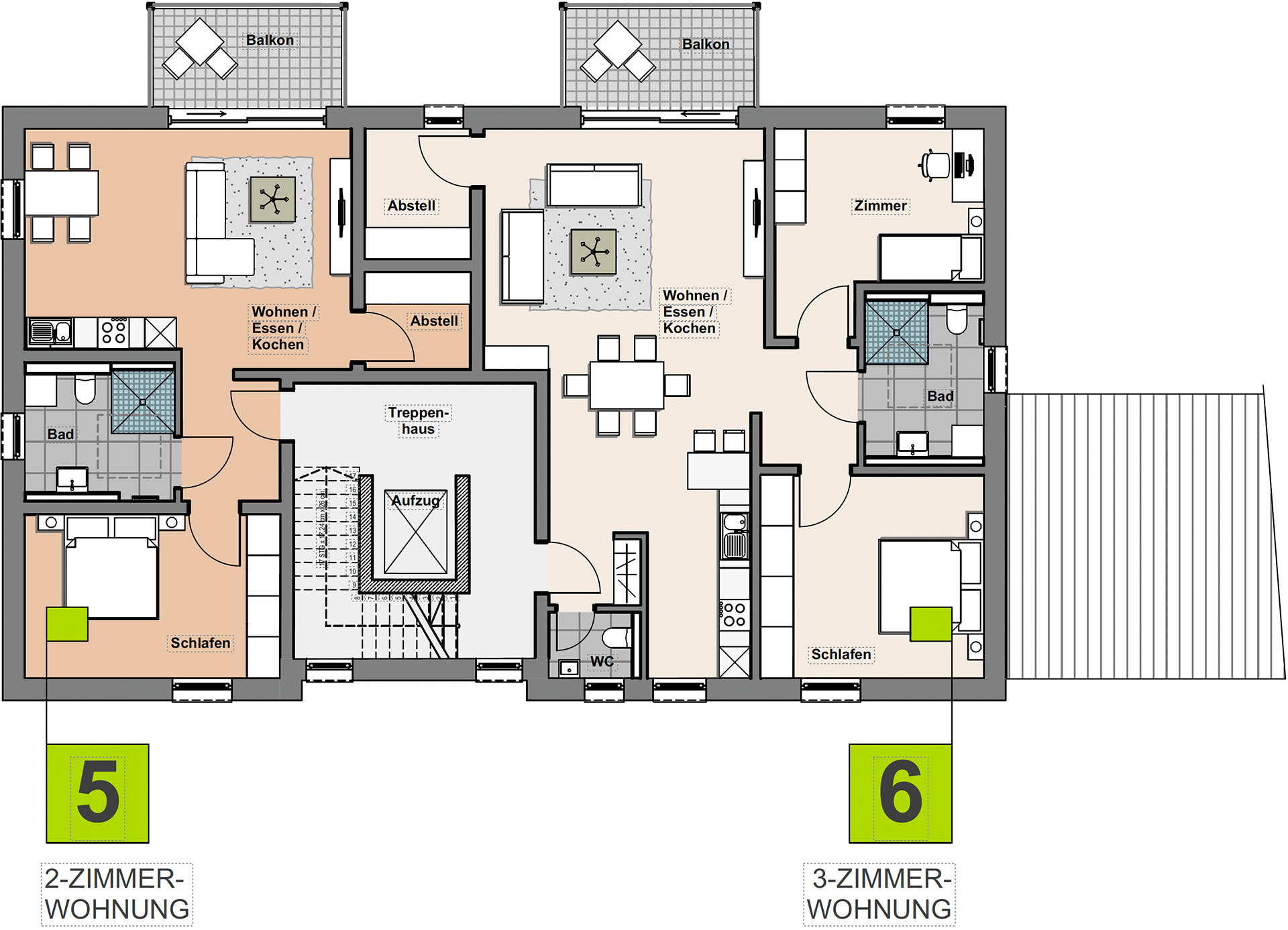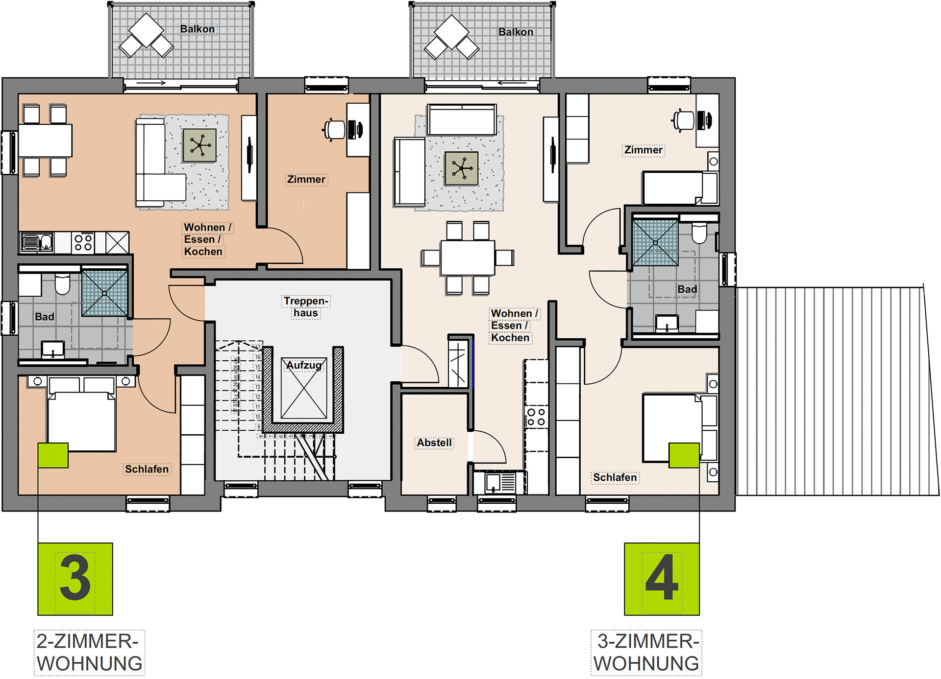 Eine Zwei- und eine Drei-Zimmer-Wohnung mit jeweils großzügigem Balkon finden sich im 2. Obergeschoss. Erreichbar sind die Wohnungen bequem über einen Aufzug.